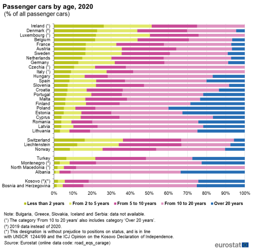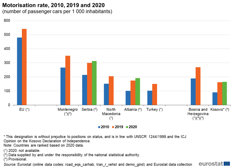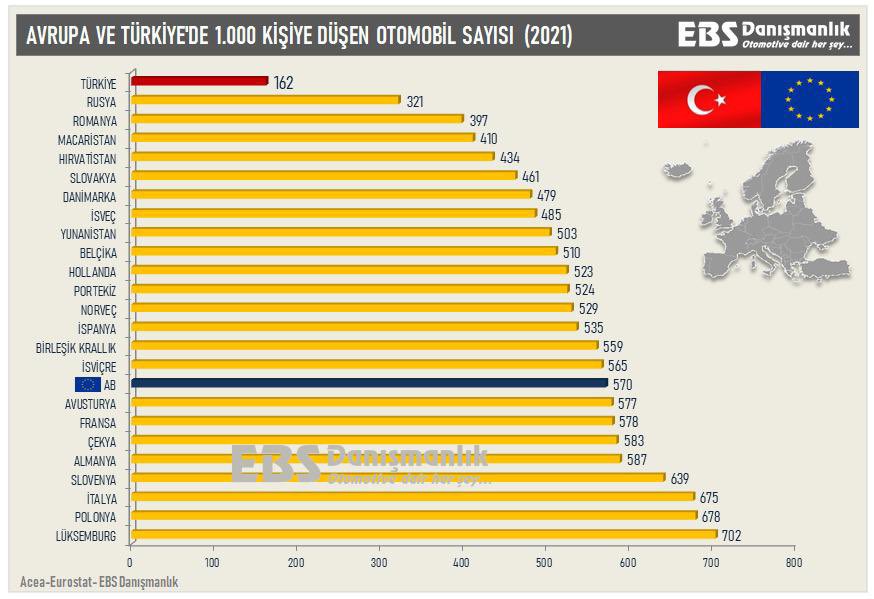 AB İstatistik Ofisi (Eurostat) tarafından derlenen AB üyesi ülkeler, AB üyeliğine aday ülkeler ve bölgede yer alan ülkeleri kapsayan 2020 yılından istatistiğe göre Türkiye kişi başına en az araç düşen ülke. OECD verilerine göre de Türkiye otomobil sahipliği açısından ortalamanın gerisinde kalmış durumda.