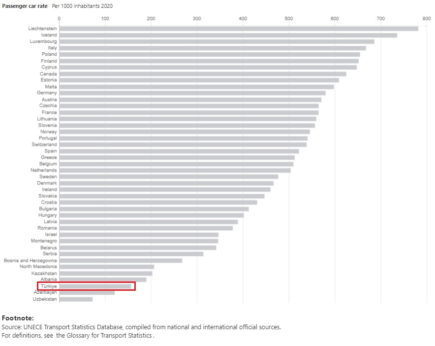 Birleşmiş Milletler Avrupa Ekonomik Konseyi (UNECE) yolcu taşıt sıralamasında Türkiye sondan 3. sırada yer alıyor.