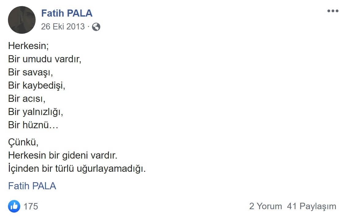 Anılan mısralar sanılanın aksine Turgut Uyar’la bir ilgisi bulunmamaktadır. Şiir Turgut Uyar’a değil Fatih Pala adlı şaire aittir.