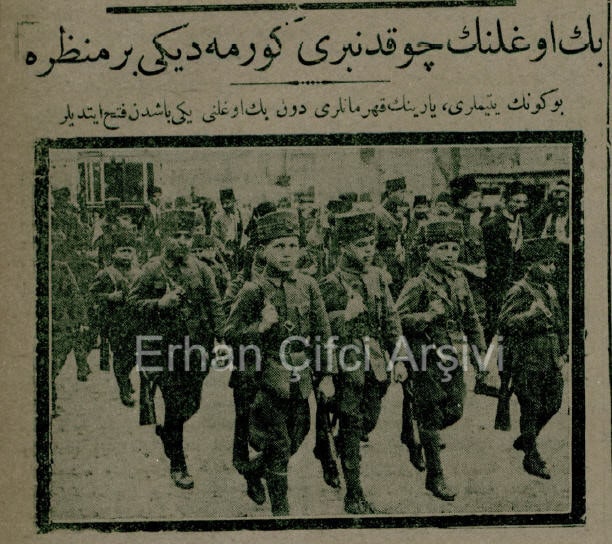 “Sin-i mükellefiyet haricinde istihdam olunacak derecede pek küçük yaşında bulunanların harp gönüllüsü olarak orduya kabullerine dair müracaat vaki olmakta olduğundan bunlardan aşağıda yazılı şartlar dairesinde gönüllü kabulü uygun görüşmüştür.