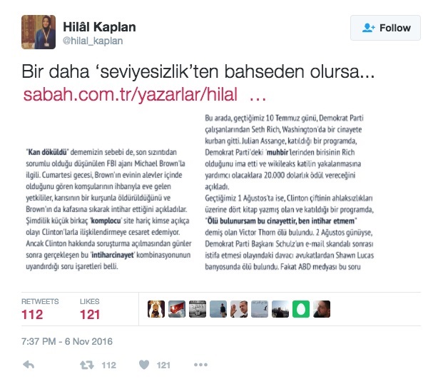 Hilal Kaplan, Sabah Gazetesi’nde 8 Kasım 2016 tarihinde yayınlanan “Bir daha ‘seviyesizlik’ten bahseden olursa…” başlıklı yazısında Hillary Clinton’ın özel e-posta sunucusunu araştıran FBI ajanı Michael Brown’ın ölümüne ilişkin asılsız haberi “gerçek” addederek yorum yapma hatasında bulunmuş: