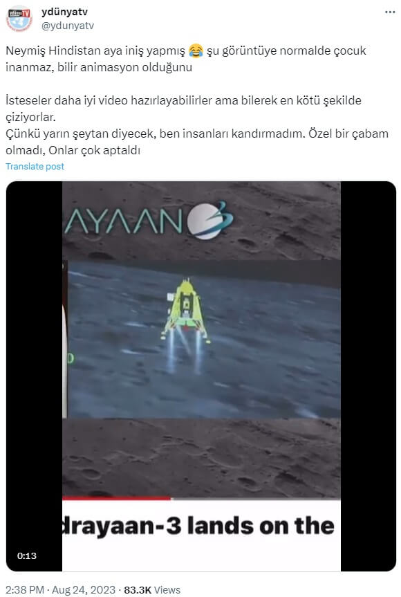 ydünyatv (@ydunyatv): “Neymiş Hindistan aya iniş yapmış şu görüntüye normalde çocuk inanmaz, bilir animasyon olduğunu İsteseler daha iyi video hazırlayabilirler ama bilerek en kötü şekilde çiziyorlar. Çünkü yarın şeytan diyecek, ben insanları kandırmadım. Özel bir çabam olmadı, Onlar çok aptaldı”