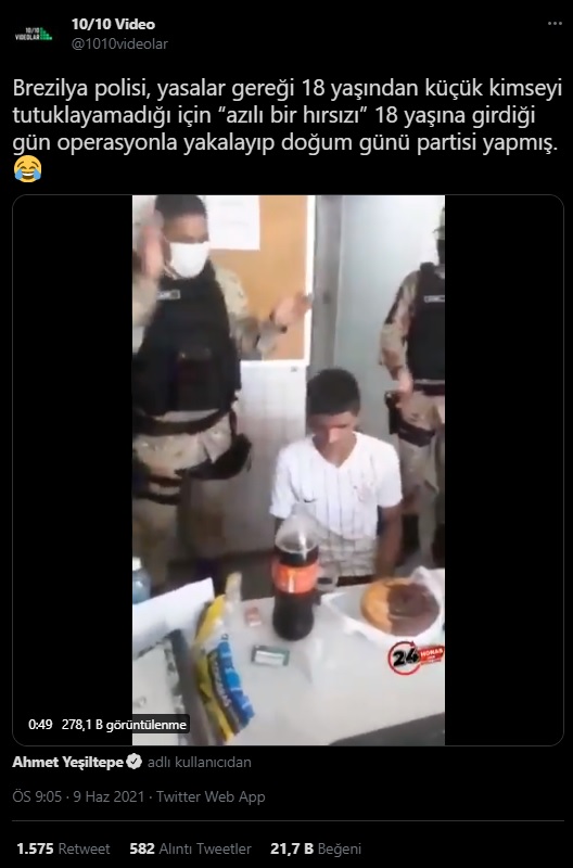 Brezilya polisinin 18 yaşından küçük olduğu için tutuklayamadığı azılı bir hırsızın reşit olmasını beklediği ve hırsızın 18 yaşına girdiği anda bir doğum günü partisi düzenlediği iddiasıyla paylaşılan videoya değineceğiz.