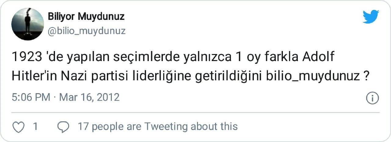 “1923 ‘de yapılan seçimlerde yalnızca 1 oy farkla Adolf Hitler’in Nazi partisi liderliğine getirildiğini bilio muydunuz ?”
