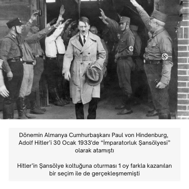 Aslında 30 Ocak 1933 tarihinde iddia edildiği gibi bir seçim gerçekleşmedi. Dönemin Almanya Cumhurbaşkanı Paul von Hindenburg, Adolf Hitler’i 30 Ocak 1933 tarihinde “Reichskanzler”, yani “İmparatorluk Şansölyesi” olarak atamıştı. Yani, Hitler’in Şansölye koltuğuna oturması 1 oy farkla kazanılan bir seçimin ardından gerçekleşmemişti.