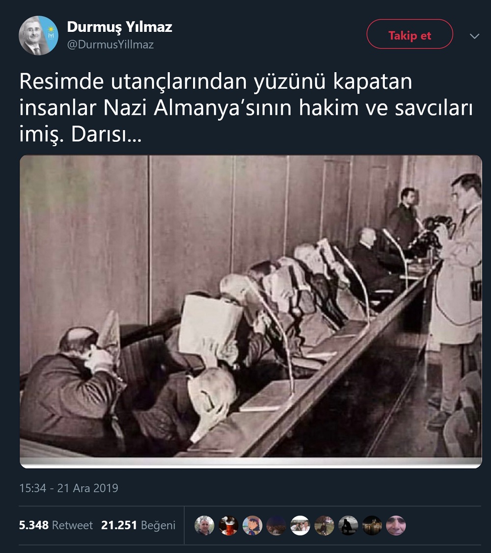 Ülkemiz yargı sistemine ilişkin eleştiri yönelten sosyal medya kullanıcılarının son dönemde, yargılama yapan hakim ve savcıların verdikleri kararlardan sonra utanacakları imasıyla bir fotoğrafı paylaştığına şahit oluyoruz.