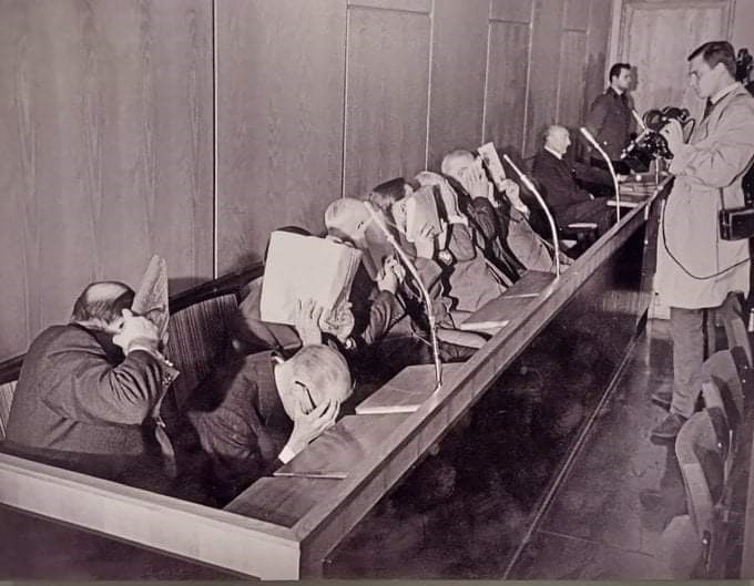Yargılama esnasında fotoğrafları çekilirken yüzlerini kapayan şahıslar Hitler’in hakim ve savcıları değil, Nazi Almanyasının Schutzstaffel olarak bilinen, kısaca SS olarak adlandırılan özel askeri birlik görevlileridir. Fotoğraf, SS personelinin Treblinka kampında işledikleri suçlar nedeniyle yürütülen Treblinka Davaları adı verilen ceza yargılamasının 2. bölümü esnasında 12 Ekim 1964 tarihinde Almanya’nın Dusseldorf şehrinde çekilmiş.