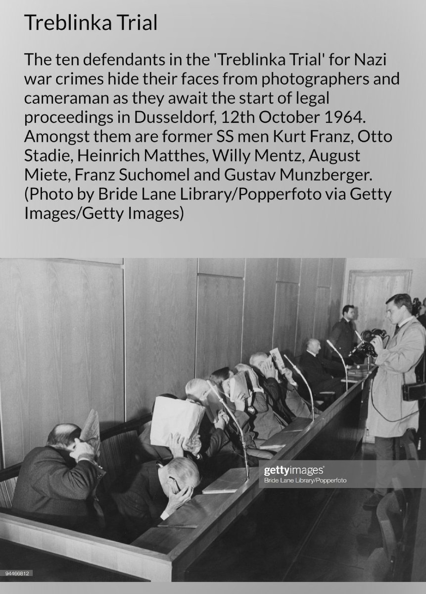 12 Ekim 1964 ve 24 Ağustos 1965 tarihleri arasında yürütülen 2. Treblinka yargılama süreci kapsamında yargılanan fotoğrafta görünen yüzünü kapatan kişilerin adlarının Kurt Franz, Otto Stadie, Heinrich Matthes, Willy Mentz, August Miete, Franz Suchomel ve Gustav Munzberger olduğu aktarılmaktadır. Aktarılan isimleri taradığımızda ise hiçbirinin hakim ya da savcı olmadığı, SS birliklerinde görev alan askerler olduğu görülmektedir.