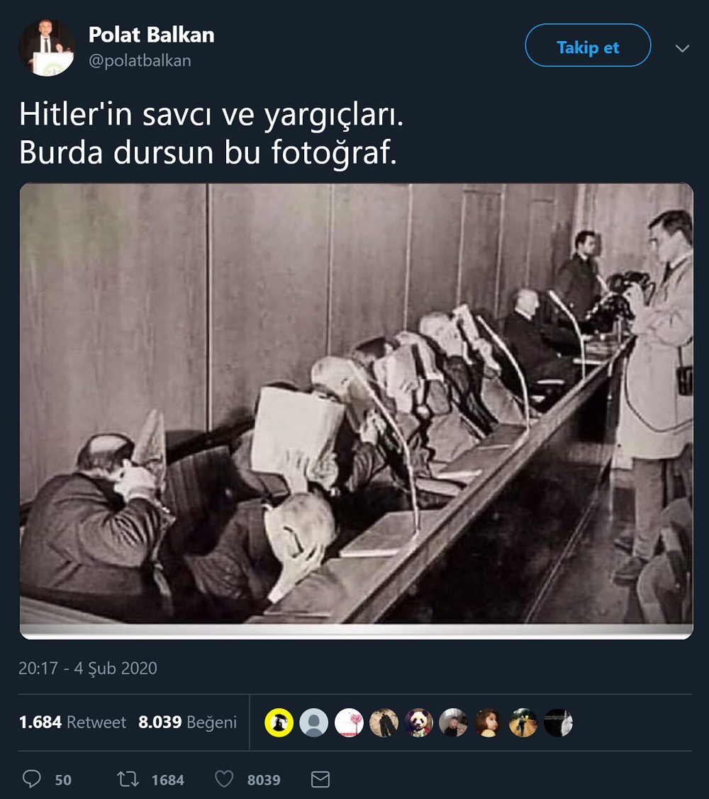 “Hitler’in hakim ve savcıları”na ait olduğu iddiasıyla bahsi geçen fotoğrafı “resimde utançlarından yüzünü kapatan insanlar Nazi Almanya’sının hakim ve savcıları imiş” notuyla aktaran paylaşımlardan bazıları şu şekilde: