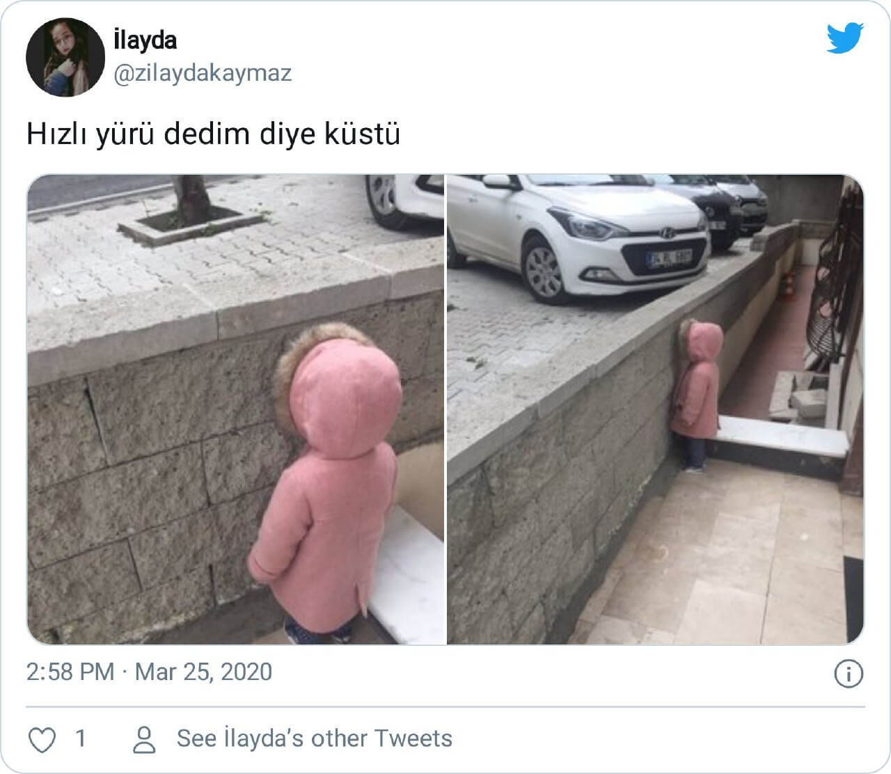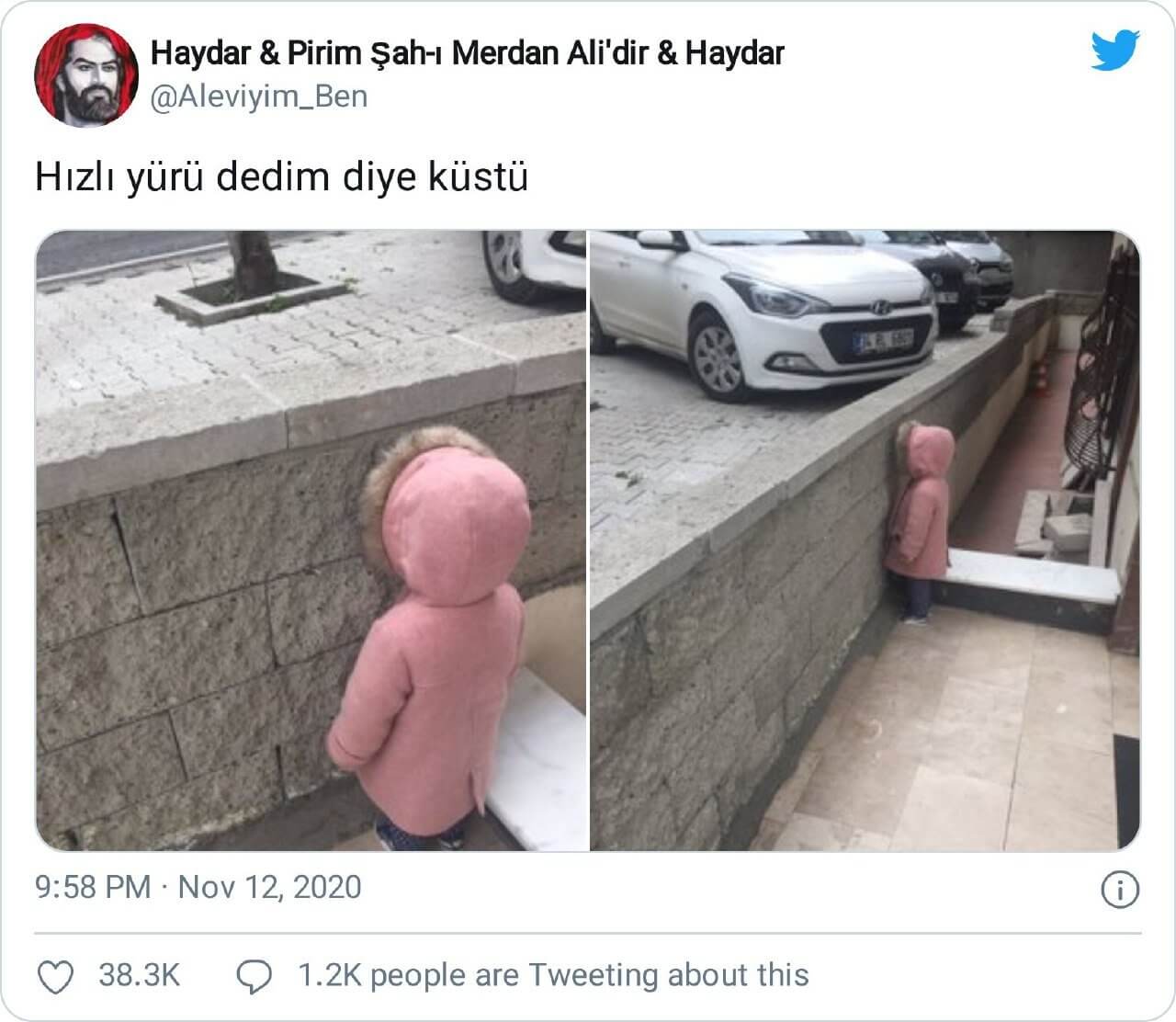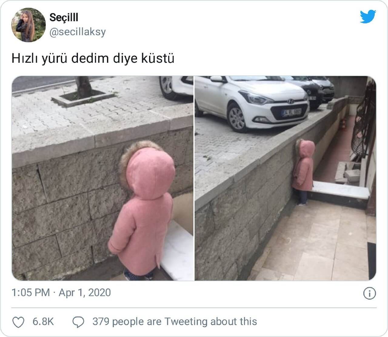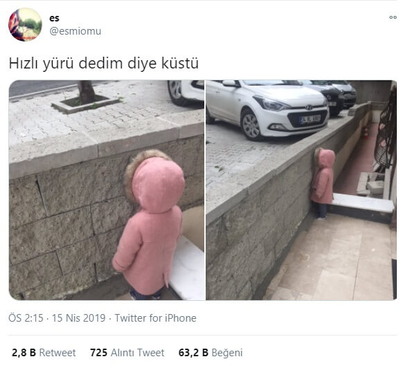 Bu durumun bir örneğine “Hızlı yürü dedim diye küstü” notunu içeren ve bir ufaklığın yüzünü duvara dönük şekilde yer aldığı fotoğrafları içeren paylaşımlarda rastlıyoruz.