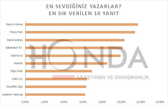 “Aynı zamanda Muzaffer İzgü, Oğuz Atay, S. Hawking gibi isimler her kesim tarafından seviliyor. Allah cevabını veren insanların çokluğu ise dinin toplumsal hayata nüfuzuna kanıt olarak gösterilebilir. Atatürk ise Nutuk ve Geometri gibi eserleriyle en sevilen yazarlar arasında.”