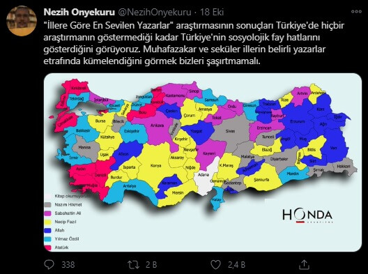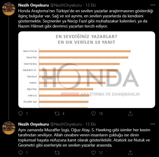 “Honda Araştırma’nın Türkiye’de en sevilen yazarlar araştırmasının gösterdiği ilginç bulgular var. Sağ ve sol ayrımı, en sevilen yazarlarda da kendisini göstermekte. Seçmenler ya Necip Fazıl gibi muhafazakar kalemleri, ya da Nazım Hikmet gibi devrimci yazarları tercih ediyor.”