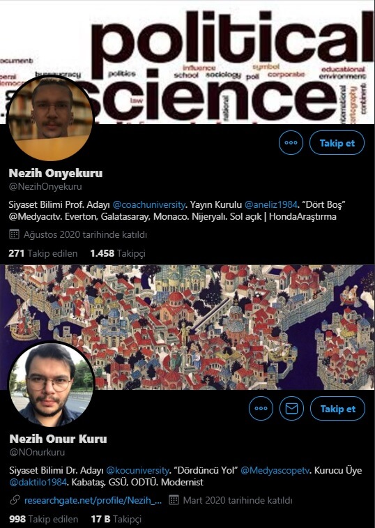 Nezih Onur Kuru’nun profilinde de “Siyaset Bilimi Dr. Adayı @kocuniversity . “Dördüncü Yol” @Medyascopetv . Kurucu Üye @daktilo1984 . Kabataş, GSÜ, ODTÜ. Modernist” açıklaması yer alıyor.