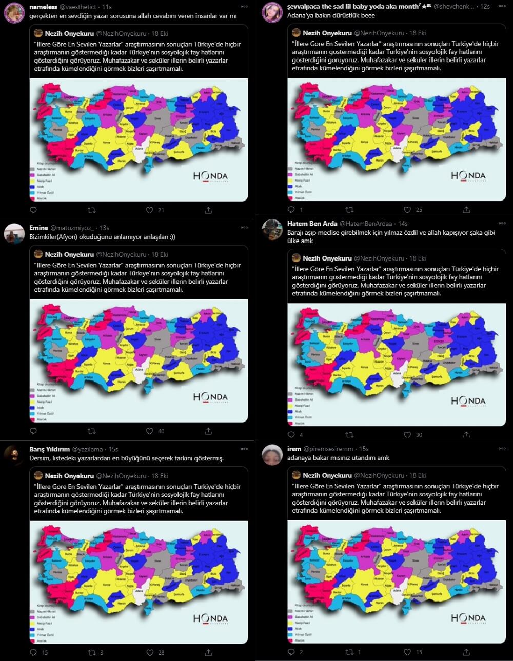 Honda Danışmanlık ve Araştırma adlı firmanın “illere göre en sevilen yazarlar” adlı araştırması sonuçlarına ait olduğu iddiasıyla bazı veri görselleştirmelerinin 18 Ekim 2020 günü sosyal medyada paylaşılmasının ardından kayda değer sayıda sosyal medya kullanıcısı tarafından ciddiye alınarak paylaşıldığına şahit olduk (İşbu yazı itibarıyla ilgili paylaşımın aldığı 1900 alıntı RT’nin önemli bir bölümünün anketi gerçek sanarak yorumladığı görülebiliyor). Ancak sanılanın aksine, Honda Araştırma’nın “en sevilen yazarlar” araştırması aslında parodi bir profilin trollemesiydi.