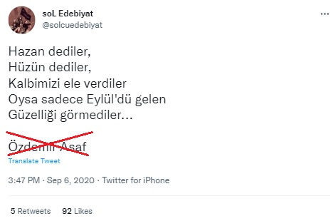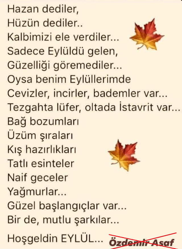 Benzer şekilde aşağıdaki Eylül konulu dizelerin de sahipliğinin Özdemir Asaf’a atfedilerek paylaşıldığı görülüyor: