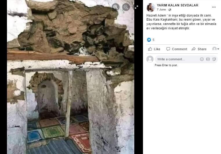 Bahse konu görseldeki mescidin Hz. Âdem tarafından inşa edildiğine dair hatalı aktarımı içeren sosyal medya paylaşımlarından örnekler şöyle sunulabilir: