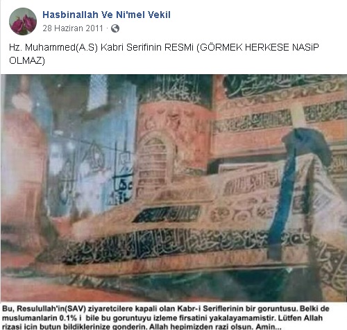 Bahse konu resmin, “Hz Muhammed’in (s.a.v) Kabri Şerifleri yeni görüntüsü“, “Hz. Muhammed (a.s.) Kabri Şerifinin Resmi (Görmek Herkese Nasip Olmaz)” ya da “Efendimizin kabri (Gizli çekim)” notuyla paylaşıldığı görülmektedir.