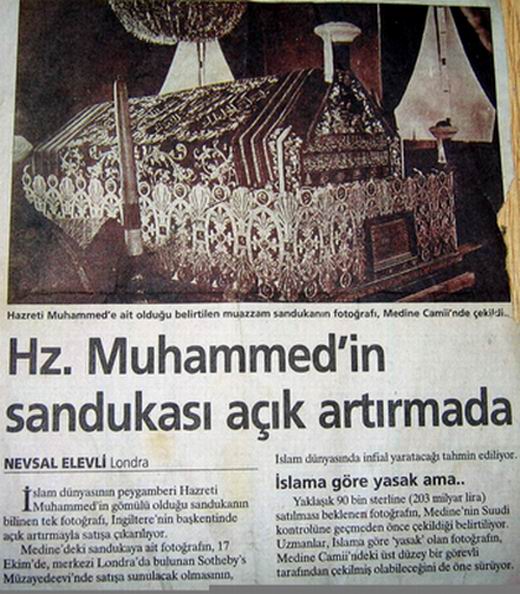 Nevsal Elevli tarafından hazırlanan Milliyet Gazetesi‘nde 28 Eylül 2001 tarihinde yayınlanan “Hz. Muhammed’in sandukası açık artırmada” başlıklı haber metninde Hazreti Muhammed’in gömülü olduğu sandukanın bilinen tek fotoğrafının Londra’da açık artırmaya çıkarıldığı iddia edilmişti.