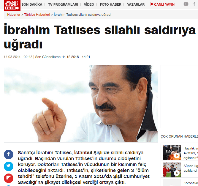 Bilindiği üzere ünlü sanatçı İbrahim Tatlıses, 14 Mart 2011 tarihinde bir televizyon kanalının çekimlerine katıldıktan sonra TV kanalının binasından ayrılırken silahlı saldırıya uğradı. Tatlıses’in içinde bulunduğu ve ön koltukta oturduğu bilindiği arabasına 11 el ateş edildi. Tatlıses, silahlı saldırı sonucu yaralanıp hastaneye kaldırıldı. Başının sağ tarafından yaralanan ve durumu ağır olan sanatçı, uzun süre tedavi görmüş ve tedavi sonrası sağlığına kavuşabildi.
