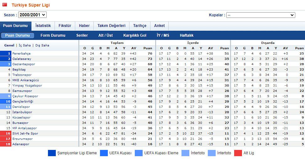 Fenerbahçe, 1999-2000 sezonunun son karşılaşması olan Denizlispor maçından, 2001-2002 sezonunda 13. haftadaki Beşiktaş maçına kadar Kadıköy’de ligde üst üste 24 maç kazandı.