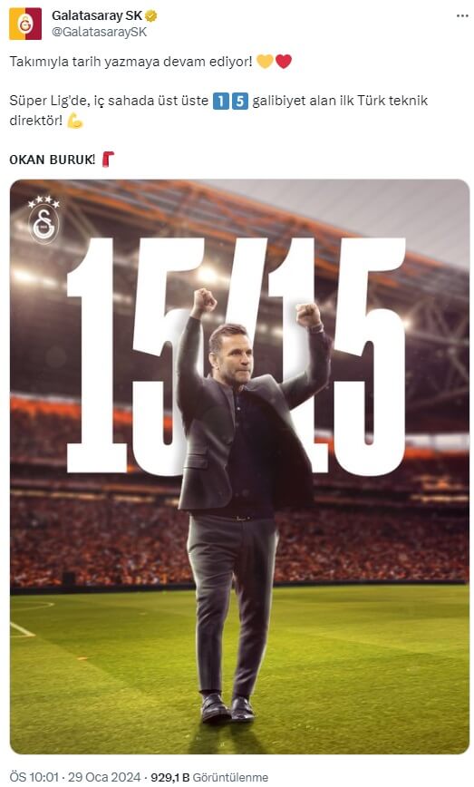Okan Buruk’un bu başarısı Galatasaray’ın resmî sosyal medya hesaplarında “Süper Lig’de, iç sahada üst üste 15 galibiyet alan ilk Türk teknik direktör!” cümlesiyle paylaşıldı.