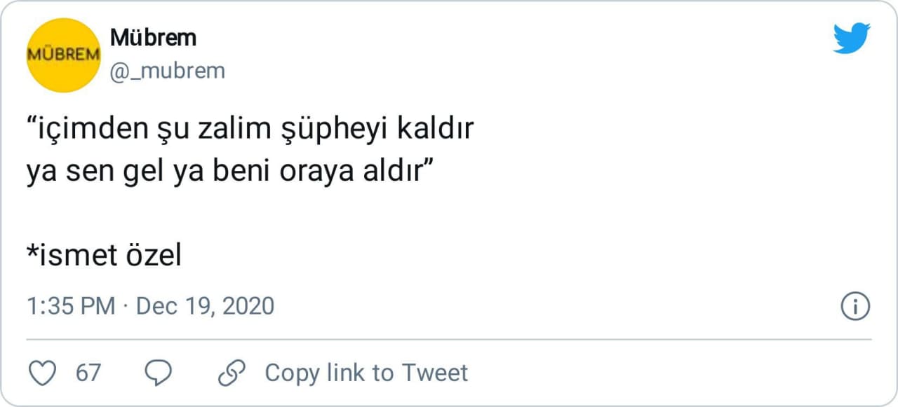 "O günden itibaren ne zaman “Ya beni de götür, ya sen de gitme” türküsünü dinlesem, “İçimden şu zalim şüpheyi kaldır/ Ya sen gel ya beni oraya aldır” diye devamını getirdim türkünün."