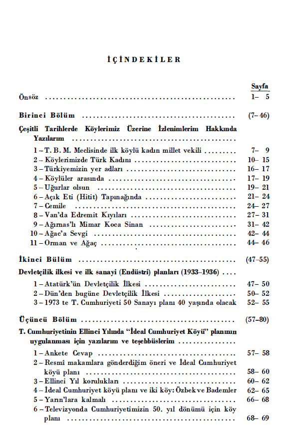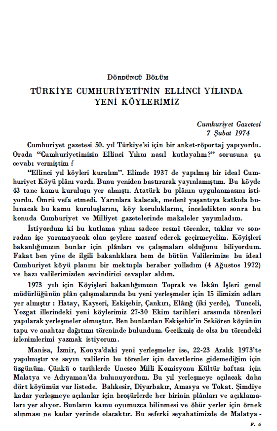 “Ellinci yıl köyleri kuralım”. Elimde 1937 de yapılmış bir ideal Cumhuriyet Köyü planı vardı. Bunu yeniden bastırarak yayınlamıştım. Bu köyde 43 tane kamu kuruluşu yer almıştı. Atatürk bu planın uygulanmasını istiyordu. Ömrü vefa etmedi. Yarınlara kalacak, medeni yaşantıya katkıda bulunacak bu kamu kuruluşlarını, köy koruluklarını, inceledikten sonra bu konuda Cumhuriyet ve Milliyet gazetelerinde makaleler yayımladım. İstiyordum ki bu kutlama yılını sadece resmi törenler, taklar ve sonradan işe yaramayacak olan şeylere masraf ederek geçirmeyelim. Köyişleri bakanlığımızın bunlar için planları ve çalışmaları olduğunu biliyordum. Fakat ben yine de ilgili bakanlıklara hem de bütün Valilerimize hu ideal Cumhuriyet köyü planını bir mektupla beraber yolladım (4 Ağustos 1972) ve bazı valilerimizden sevindirici cevaplar aldım.”