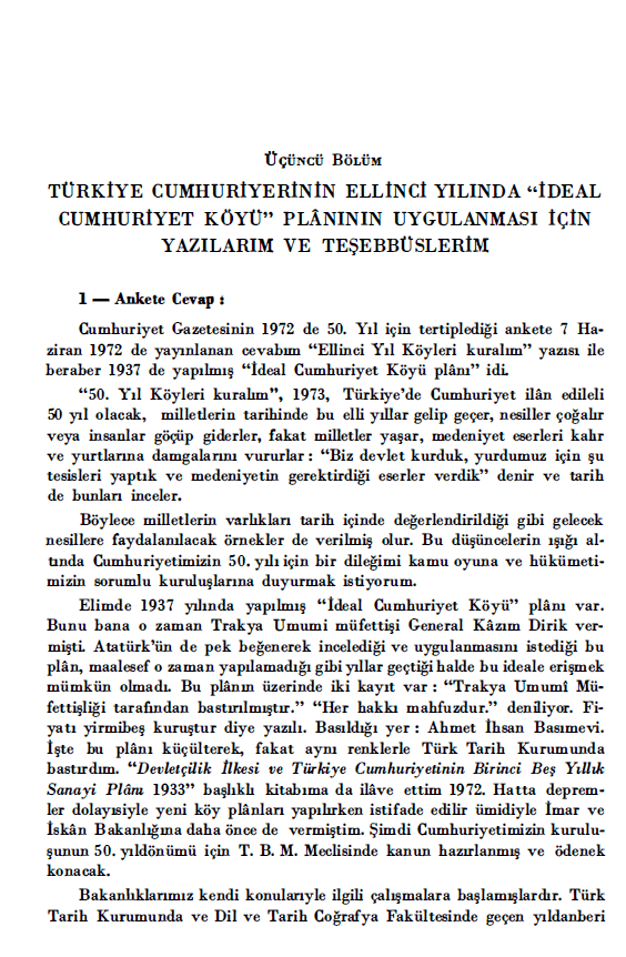 “Elimde 1937 yılında yapılmış “İdeal Cumhuriyet Köyü” planı var. Bunu bana o zaman Trakya Umumi müfettişi General Kazım Dirik vermişti. Atatürk’ün de pek beğenerek incelediği ve uygulanmasını istediği bu plan, maalesef o zaman yapılamadığı gibi yıllar geçtiği halde bu ideale erişmek mümkün olmadı. Bu planın üzerinde iki kayıt var : “Trakya Umumi Müfettişliği tarafından bastırılmıştır.” “Her hakkı mahfuzdur.” deniliyor. Fiyatı yirmibeş kuruştur diye yazılı. Basıldığı yer: Ahmet İhsan Basımevi. İşte bu planı küçülterek, fakat aynı renklerle Türk Tarih Kurumunda bastırdım. “Devletçilik İlkesi ve Türkiye Cumhuriyetinin Birinci Beş Yıllık Sanayi Planı 1933″ başlıklı kitabıma da ilave ettim 1972. Hatta depremler dolayısiyle yeni köy planlan yapılırken istifade edilir ümidiyle İmar ve İskan Bakanlığına daha önce de vermiştim. Şimdi Cumhuriyetimizin kuruluşunun 50. yıldönümü için T. B. M. Meclisinde kanun hazırlanmış ve ödenek konacak.”