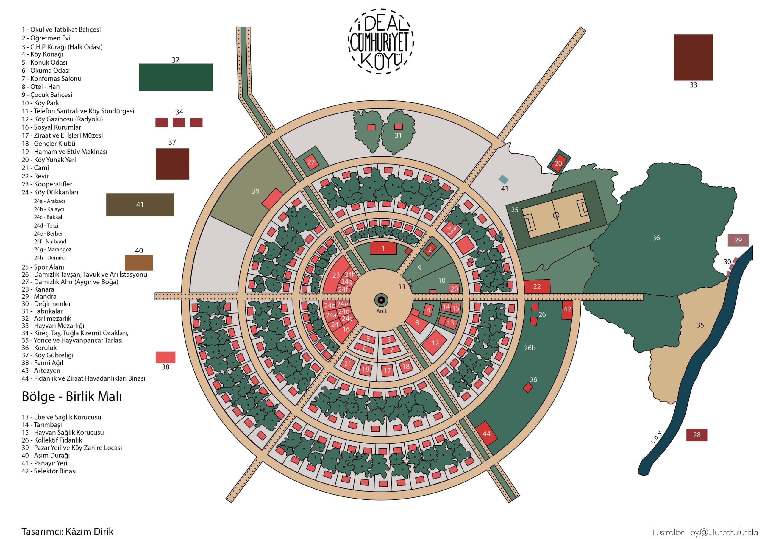 Ömer Atabeyoğlu, “Atatürk’ün kırsal kalkınma projesi ‘İdeal Cumhuriyet Köyü Projesi’ nin mekân kuramları açısından değerlendirilmesi” başlıklı makalesinde 1937 yılında çizilen, Trakya Umumi Müfettişi General Kazım Dirik tarafından Atatürk’ün manevi kızı Afet İnan’a verilen ve üzerinde mimarının ismi bulunmayan “İdeal Cumhuriyet Köyü Projesi” ile Atatürk’ün bizzat ilgilendiği, üzerinde çalıştığı ve uygulanmasını desteklediği ifade edilmiş.