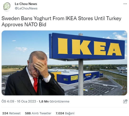 İsveç’in ünlü IKEA mağaza zincirlerinde yoğurt satışını, NATO üyelik başvurularının Türkiye tarafından onaylanana değin yasakladığı yönünde Le Chou News adlı parodi içerikler paylaşan profil tarafından kurgulanan iddianın bazı sosyal medya kullanıcıları tarafından gerçek sanıldığı görülüyor.