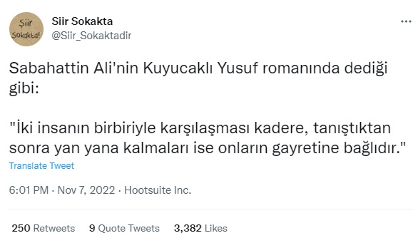 Sabahattin Ali’nin Kuyucaklı Yusuf romanında dediği gibi:“İki insanın birbiriyle karşılaşması kadere, tanıştıktan sonra yan yana kalmaları ise onların gayretine bağlıdır.”