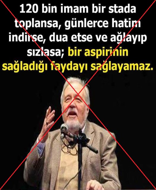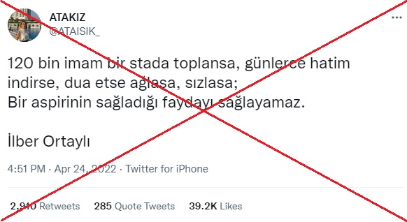 Anonim şekilde paylaşılan “120 bin imam bir stada toplansa, günlerce hatim indirse, dua etse, ağlasa, sızlasa, bir aspirinin sağladığı faydayı sağlamaz.” şeklindeki sözün de ismi ve fotoğraflarıyla birlikte servis edilmesinin ardından İlber Ortaylı’ya ait olduğu algısının oluştuğu anlaşılıyor.