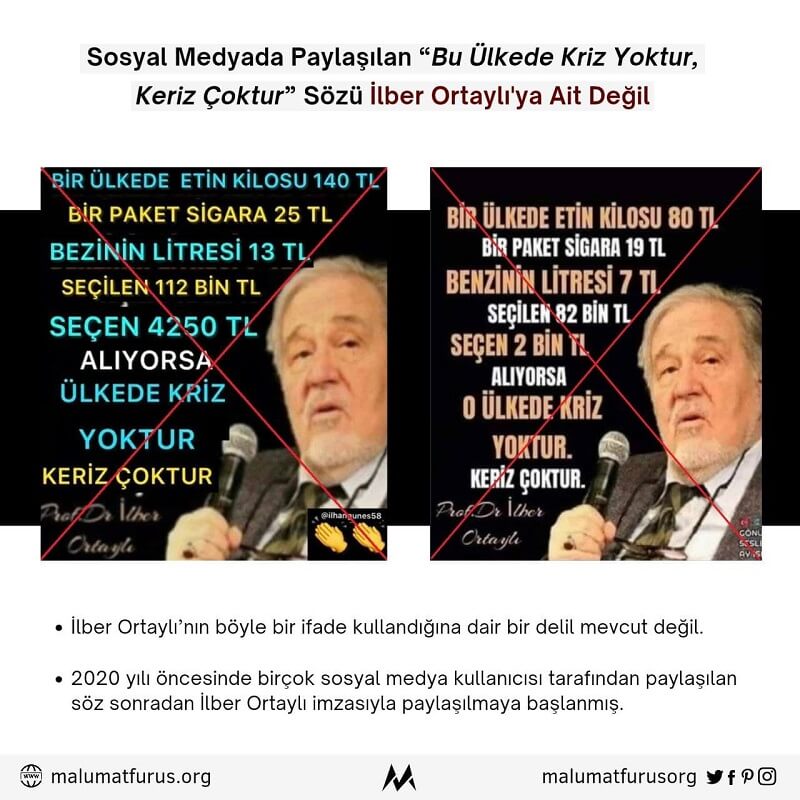 Hayat pahalılığından şikâyetle farklı ürün ve hizmet fiyatları ve maaş kıyasıyla paylaşılan “bu ülkede kriz yoktur, keriz çoktur” sözü İlber Ortaylı’ya ait değil. İlber Ortaylı’nın “Bir ülkede etin kilosu 140 TL bir paket sigara 25 TL benzinin litresi 13 TL seçilen 112 bin seçen 4250 TL alıyorsa o ülkede kriz yoktur keriz çoktur” şeklinde bir ifade kullandığına dair bir delil mevcut değil. Geçmişe yönelik tarama yapıldığında, fiyat artışlarına, gelir adaletsizliğine, ücret düşüklüğüne yönelik eleştirilerle birlikte kullanılan sözün zaman içerisinde İlber Ortaylı’ya atfedilir hâle geldiği anlaşılıyor. 2020 yılı öncesinde farklı birçok sosyal medya kullanıcısı tarafından paylaşılan anonim nitelikteki söz sonradan İlber Ortaylı imzasıyla paylaşılmaya başlanmış. Geçen zamanla birlikte, bahse konu sözde yer verilen rakamların güncellendiği de görülüyor.