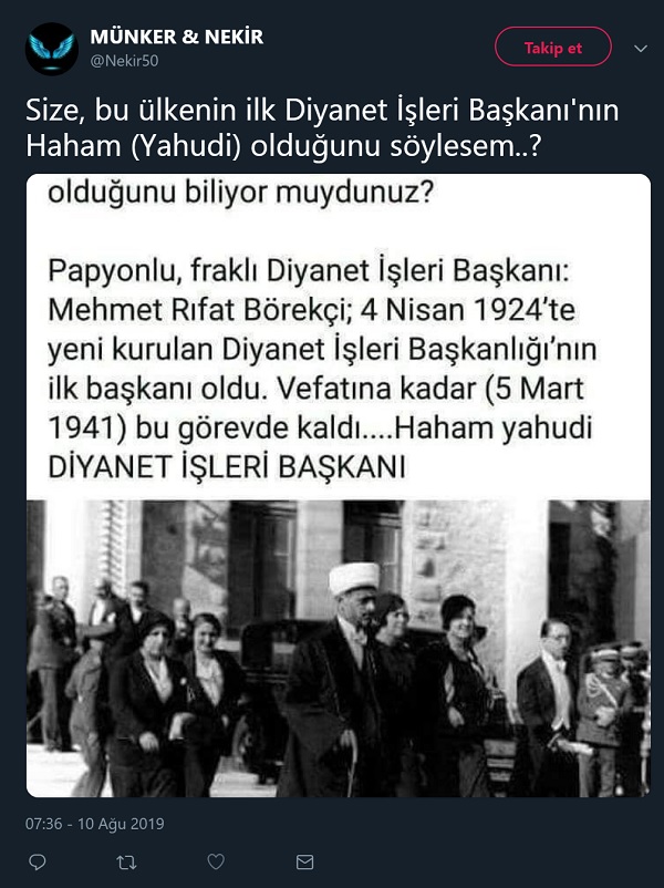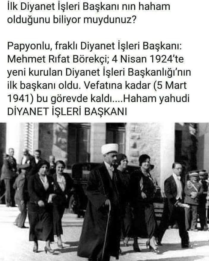 “İlk Diyanet İşleri Başkanı’nın haham olduğunu biliyor muydunuz Papyonlu, fraklı Diyanet İşleri Başkanı; Mehmet Rıfat Börekçi 04 Nisan 1924’te yeni kurulan Diyanet İşleri Başkanlığının ilk Başkanı oldu ve ölene kadar 05 Mart 1941 bu görevde kaldı. Haham yahudi DİYANET İŞLERİ BAŞKANI”