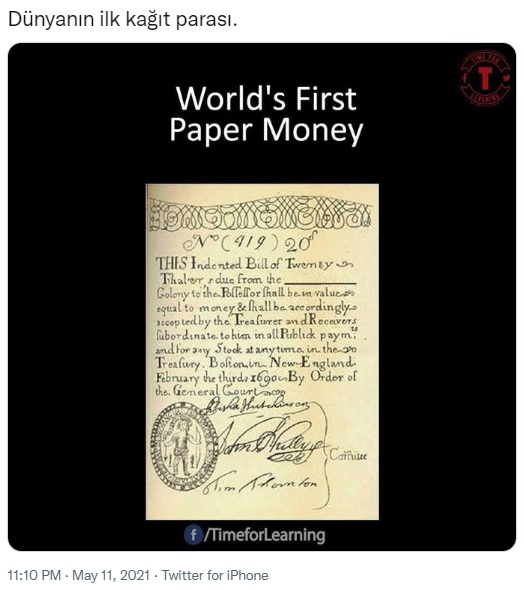 Sosyal medyada dünyanın ilk kâğıt parasına ait olduğu iddiasıyla paylaşılan yukarıda görsel ise 1690 yılında ABD kolonileri tarafından çıkarılan kâğıt paraya dair eski döneme yönelik illüstrasyonu yansıtıyor.