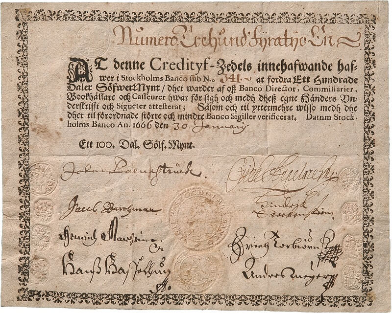 İsveç’in ilk bankası olan Stockholms Banco’nun kurucusu Johan Palmstruch tarafından 1660 yılında (bir karşılığa bağlanmaksızın) çıkarılan mevduat sertifikaları kısa süre içerisinde yaygınlık kazansa da 1664 geri çağrılarak sonlandırılmıştı.