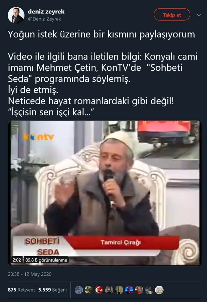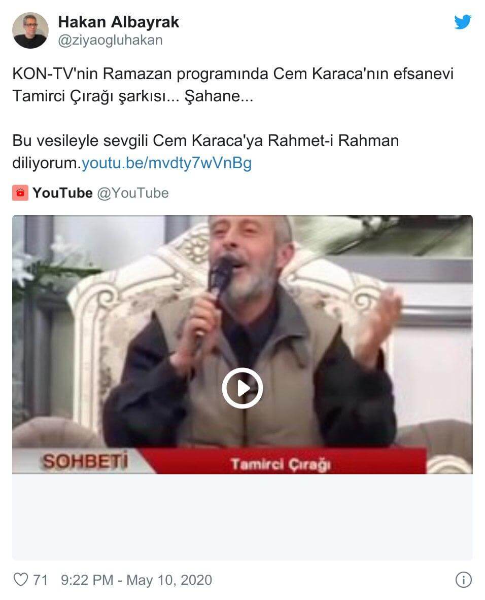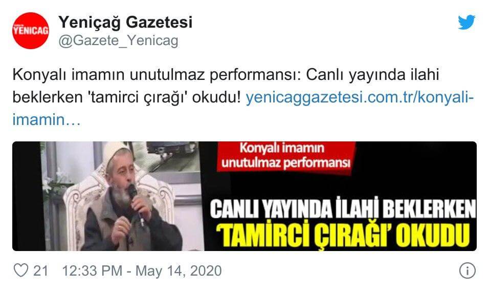 “Kon Tv de Iftar duasını yaptıktan sonra ezana birkaç dakika kalması üzerine sunucu konuk olan imamdan bir ezgi istedi.Herkes bir ilahi beklerken imam hiç beklenmedik bir şekilde Cem Karaca nın muhteşem eseri “Tamirci Çırağı ” parçasını okuyor.”