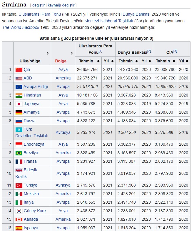 “İlk tablo, Uluslararası Para Fonu (IMF) 2021 yılı verileriyle; ikincisi Dünya Bankası 2020 verileri ve sonuncusu ise Amerika Birleşik Devletleri’nin Merkezî İstihbarat Teşkilatı (CIA) tarafından yayınlanan The World Factbook 1993–2020 yılları arasında değişen yıl verileriyle hazırlanmıştır.”
