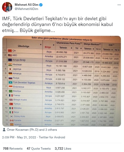 Uluslararası Para Fonu (IMF) tarafından yayımlanan istatistiklerde Türk Devletleri Teşkilâtı’nın ayrı bir devlet olarak değerlendirildiği ve bu birliğin dünyanın 6. büyük ekonomisi kabul edildiği iddiası gerçeği yansıtmıyor.