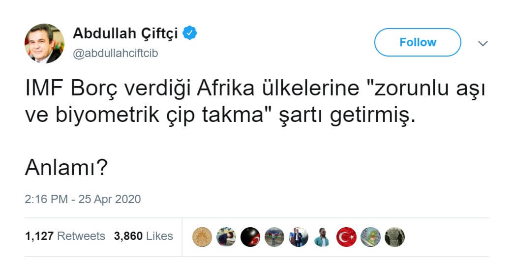 Hatırlayacağınız üzere bir takım komplo teorisi müptelaları, IMF’nin 25 Afrika ülkesine kredi sunmak için zorunlu aşı ve çip takılması gibi koşulları öne sürdüğünü iddia etmişti.