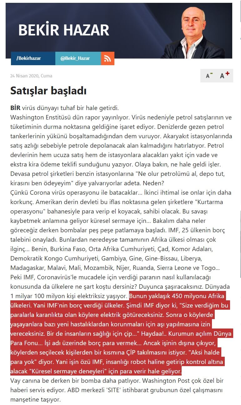 Bekir Hazar Takvim Gazetesindeki 24 Nisan 2020 tarihli “Satışlar Başladı” başlıklı yazısında bu iddiayı şöyle dile getirmişti (Uluslararası Para Fonu’nu Dünya Para Fonu diye aktarmasını da not edelim bu vesileyle):