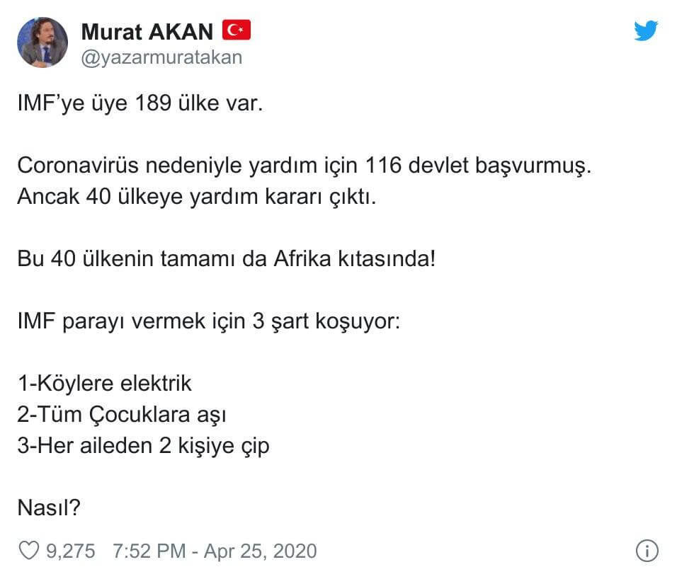 “IMF’ye üye 189 ülke var. Coronavirüs nedeniyle yardım için 116 devlet başvurmuş. Ancak 40 ülkeye yardım kararı çıktı. Bu 40 ülkenin tamamı da Afrika kıtasında! IMF parayı vermek için 3 şart koşuyor:
