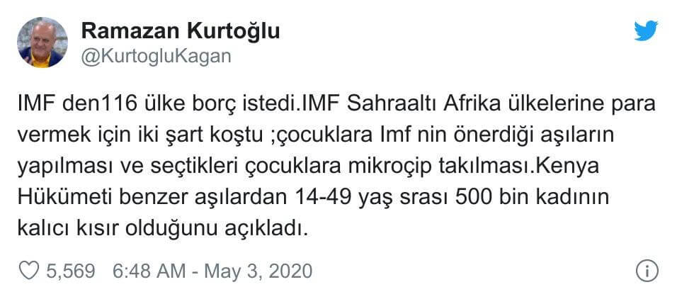 “IMF den116 ülke borç istedi.IMF Sahraaltı Afrika ülkelerine para vermek için iki şart koştu ;çocuklara Imf nin önerdiği aşıların yapılması ve seçtikleri çocuklara mikroçip takılması.Kenya Hükümeti benzer aşılardan 14-49 yaş srası 500 bin kadının kalıcı kısır olduğunu açıkladı.”