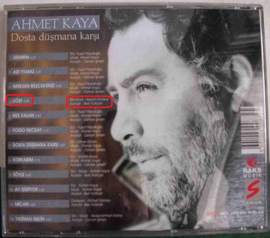 Ahmet Kaya’nın Dosta Düşmana adlı albümünde Dost adlı parçanın sözlerinin Hüseyin Karakuş’a ait olduğunun belirtildiği görülebiliyor.