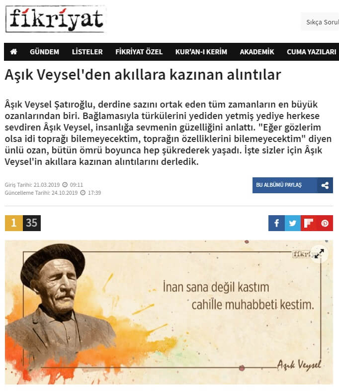 Ünlü isimlere izafe edilen sözlere en çok, doğum ve ölüm yıldönümlerinde kendilerini anmak adına kaleme alınan ancak hiçbir emek verilmeden hazırlanmış, kopyala yapıştır cümlelerden öteye gitmeyen yazılarda rastlıyoruz. Yeniçağ, Hürriyet, Haber7 gibi sitelerde yayımlanan Âşık Veysel adına hazırlanan -bugün incelediğimiz sözün de yer aldığı- her biri birbirine benzer yazılarda bu hatalı bilgi yer alıyor.