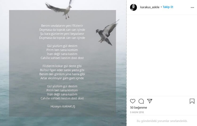 Hüseyin Karakuş, türkünün sözlerini Instagram hesabında da paylaşmıştı: