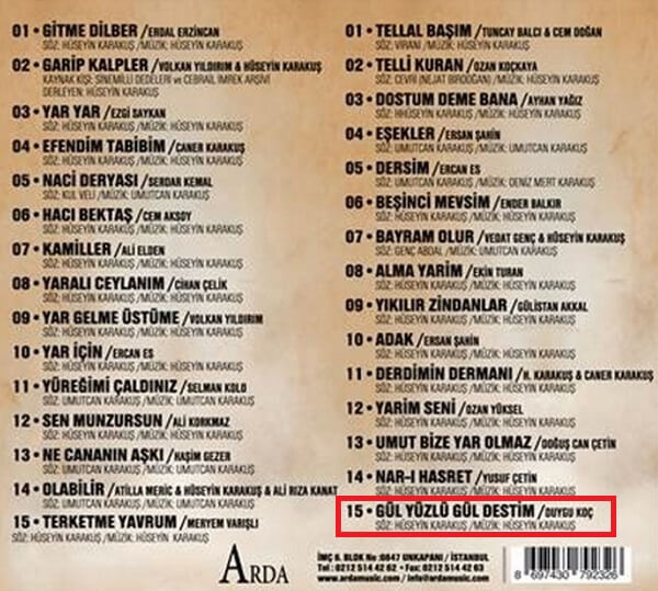 Albümün kartonetinde söz ve müziğin Hüseyin Karakuş’a ait olduğunu görmek mümkün: