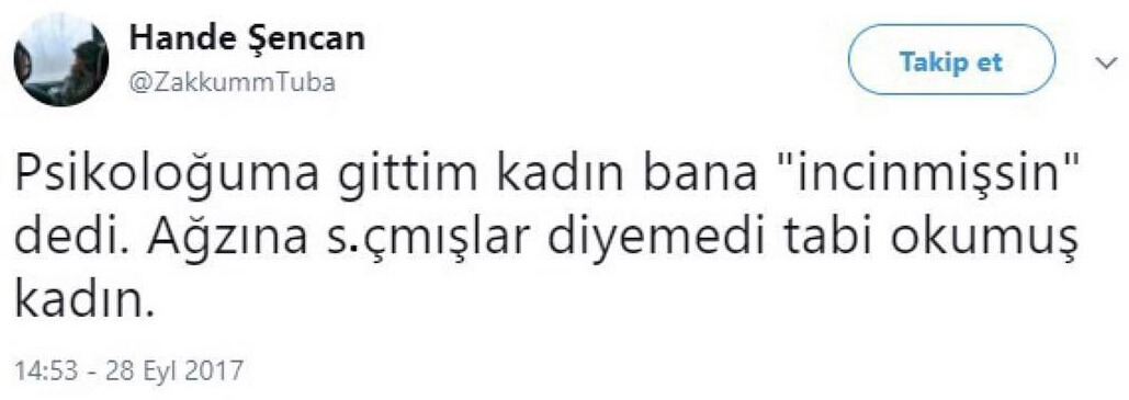 Psikoloğuma gittim kadın bana “incinmişsin” dedi. Ağzına sıçmışlar diyemedi tabi okumuş kadın.