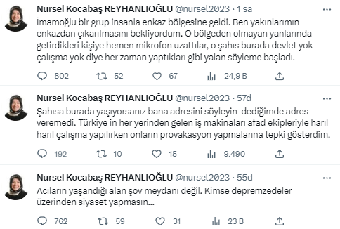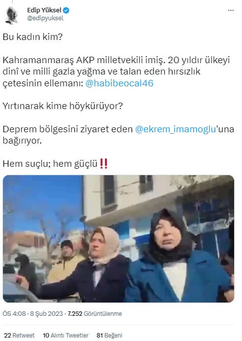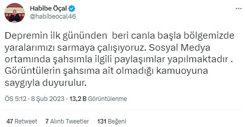 6 Şubat 2023 günü meydana gelen depremlerin ardından afet bölgesinde incelemelerde bulunan İstanbul Büyükşehir Belediye Başkanı Ekrem İmamoğlu’na “Ne geziyorsun Türkiye’yi. Sen İstanbul’una bak. Gelmeyin, defol buradan. Defolun gidin. İngiliz uşağı. Şov yapmayın. Devlet burada.” ifadeleriyle tepki gösteren kişinin AK Parti Kahramanmaraş Milletvekili Habibe Öçal olduğu sanılmış.
