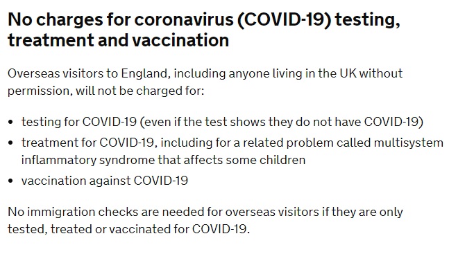 İngiltere’de NHS sisteminde sağlık hizmetleri için bir ücret ödenmiyor. Bu minvalde, Covid-19 testleri, tedavisi ve aşısı için de herhangi bir ödeme talep edilmemektedir.